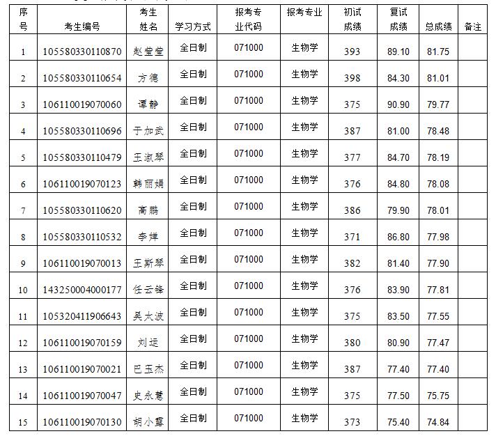 参加我院调剂复试考生共有15名,本次生物学专业调剂招生指标11名。