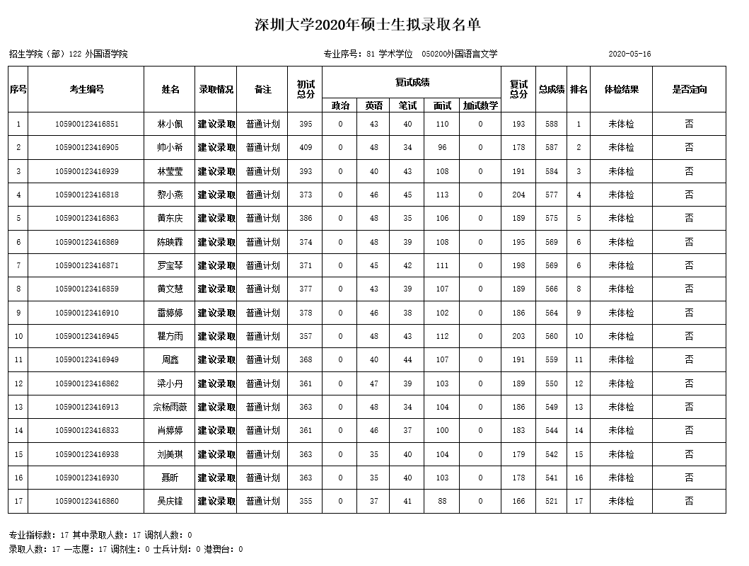 据悉,深圳大学外国语学院2020外国语言文学硕士研究生拟录取名单公示已公布,聚创深圳大学考研网小编为你整理如下内容: