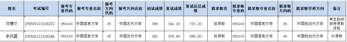 中国语言文学系(珠海)2020年硕士研究生招生复试拟录取名单变更信息如下: