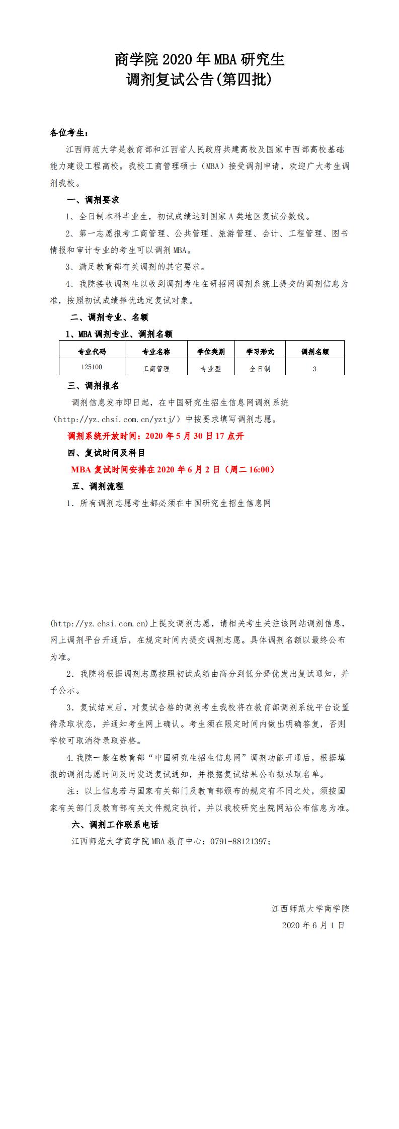 以上是聚创考研网为考生整理的"江西师范大学商学院2020年MBA调剂复试公告(十二)"的相关考研信息,希望对大家考研备考有所帮助! 备考过程中如有疑问,也可以添加老师微信juchuang911进行咨询。