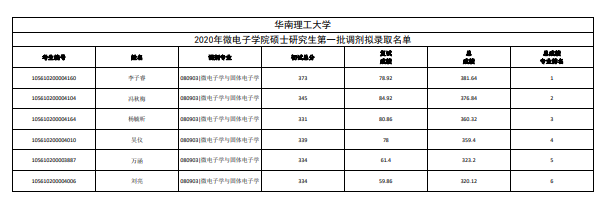 聚创华南理工大学考研网快讯,华南理工大学微电子学院2020年硕士研究第一批调剂拟录取名单公示,详情如下: