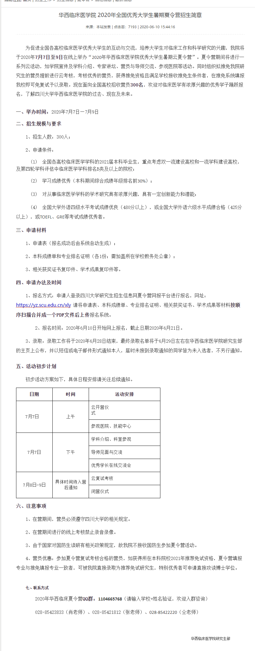 据悉,四川大学华西临床医学院2020年优秀大学生暑期夏令营招生简章已公布,聚创四川大学考研网小编为大家整理如下: