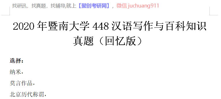以上是聚创考研网为考生整理的"2020年暨南大学448汉语写作与百科知识真题(回忆版)"的相关考研信息,希望对大家考研备考有所帮助! 备考过程中如有疑问,也可以添加老师微信juchuang911进行咨询。