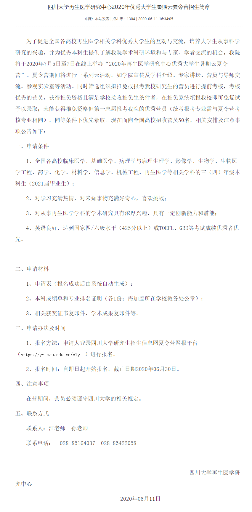 以上是聚创考研网为考生整理的"四川大学再生医学研究中心2020年优秀大学生暑期云夏令营招生简章"的相关考研信息,希望对大家考研备考有所帮助!