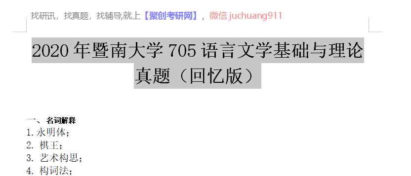 以上是聚创考研网为考生整理的"2020年暨南大学705语言文学基础与理论真题(回忆版)"的相关考研信息,希望对大家考研备考有所帮助! 备考过程中如有疑问,也可以添加老师微信juchuang911进行咨询。