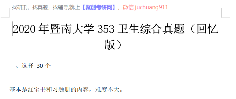 以上是聚创考研网为考生整理的"2020年暨南大学353卫生综合真题(回忆版)"的相关考研信息,希望对大家考研备考有所帮助! 备考过程中如有疑问,也可以添加老师微信juchuang911进行咨询。
