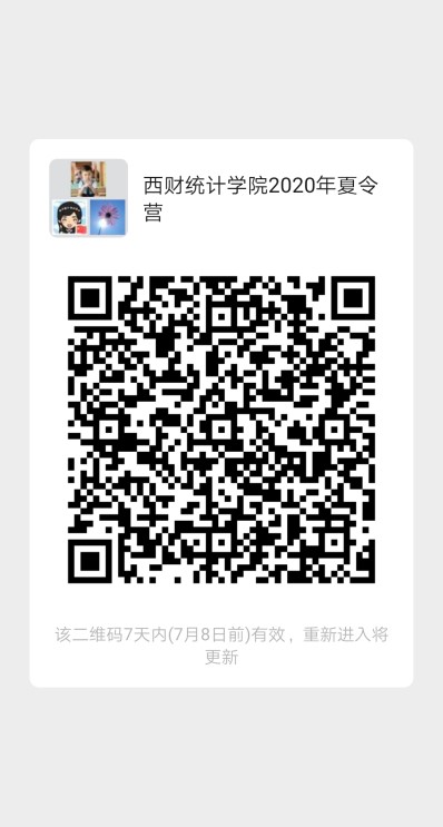 西南财经大学统计学院“2020年优秀大学生学术夏令营”经学院审查,研究生院复查,现将获得参营资格的学生名单公布如下(详见附件)。请获得参营资格学员扫描下面二维码入群(入群截止时间:7月2日上午10:00),并将备注改为“姓名+报考专业”;未获得参营资格者,不再另行通知。如有问题,请咨询: 028-87092117。
