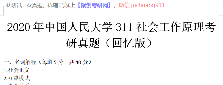 以上是聚创考研网为考生整理的"2020年中国人民大学311社会工作原理考研真题(回忆版)"的相关考研信息,希望对大家考研备考有所帮助! 备考过程中如有疑问,也可以添加老师微信juchuang911进行咨询。