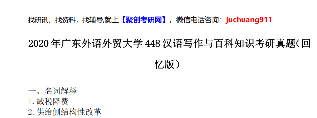 以上是聚创考研网为考生整理的"2020年广东外语外贸大学448汉语写作与百科知识考研真题(回忆版)"的相关考研信息,希望对大家考研备考有所帮助! 备考过程中如有疑问,也可以添加老师微信juchuang911进行咨询。