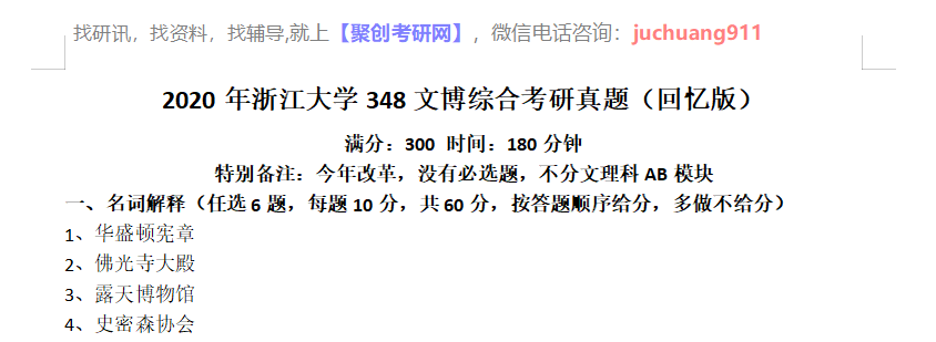 以上是聚创考研网为考生整理的"2020年浙江大学348文博综合考研真题(回忆版)"的相关考研信息,希望对大家考研备考有所帮助! 备考过程中如有疑问,也可以添加老师微信juchuang911进行咨询。