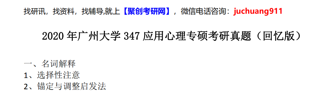 以上是聚创考研网为考生整理的"2020年广州大学347应用心理专硕考研真题(回忆版)"的相关考研信息,希望对大家考研备考有所帮助! 备考过程中如有疑问,也可以添加老师微信juchuang911进行咨询。