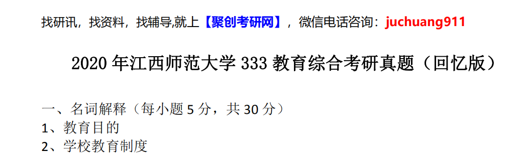 以上是聚创考研网为考生整理的"2020年江西师范大学333教育综合考研真题(回忆版)"的相关考研信息,希望对大家考研备考有所帮助! 备考过程中如有疑问,也可以添加老师微信juchuang911进行咨询。