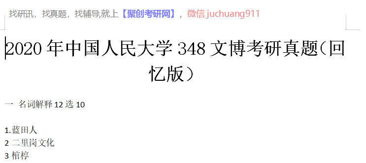 以上是聚创考研网为考生整理的"2020年中国人民大学348文博考研真题(回忆版)"的相关考研信息,希望对大家考研备考有所帮助! 备考过程中如有疑问,也可以添加老师微信juchuang911进行咨询。
