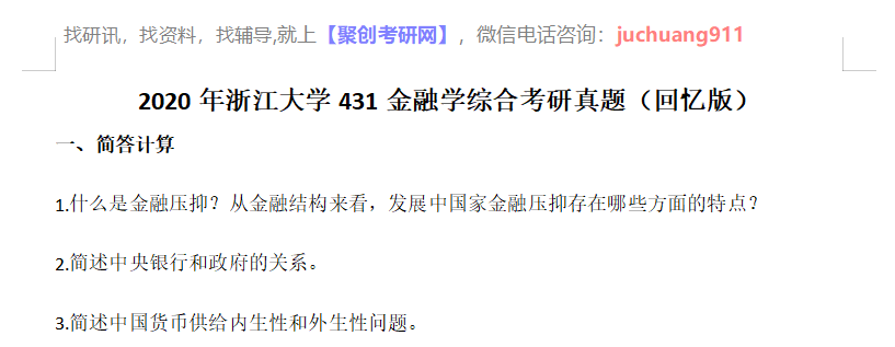 以上是聚创考研网为考生整理的"2020年浙江大学431金融学综合考研真题(回忆版)"的相关考研信息,希望对大家考研备考有所帮助! 备考过程中如有疑问,也可以添加老师微信juchuang911进行咨询。