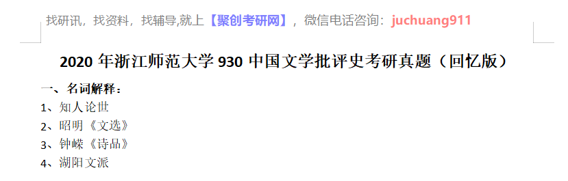 以上是聚创考研网为考生整理的"2020年浙江师范大学930中国文学批评史考研真题(回忆版)"的相关考研信息,希望对大家考研备考有所帮助! 备考过程中如有疑问,也可以添加老师微信juchuang911进行咨询。