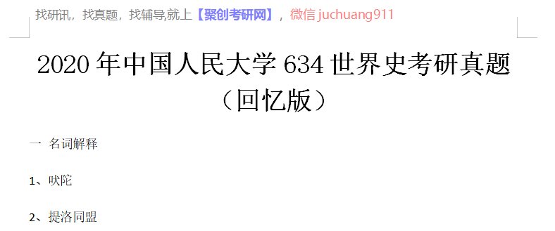 完整版请下载附件:2020年中国人民大学634世界史考研真题(回忆版)