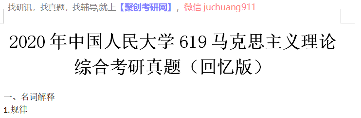 以上是聚创考研网为考生整理的"2020年中国人民大学619马克思主义理论综合考研真题(回忆版)"的相关考研信息,希望对大家考研备考有所帮助! 备考过程中如有疑问,也可以添加老师微信juchuang911进行咨询。