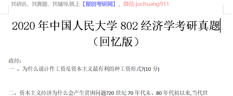 以上是聚创考研网为考生整理的"2020年中国人民大学802经济学考研真题(回忆版)"的相关考研信息,希望对大家考研备考有所帮助! 备考过程中如有疑问,也可以添加老师微信juchuang911进行咨询。