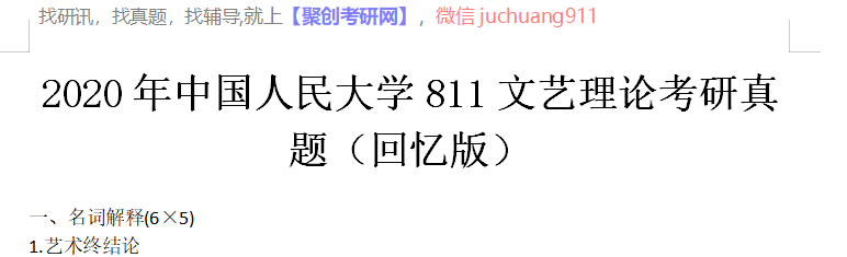以上是聚创考研网为考生整理的"2020年中国人民大学811文艺理论考研真题(回忆版)"的相关考研信息,希望对大家考研备考有所帮助! 备考过程中如有疑问,也可以添加老师微信juchuang911进行咨询。