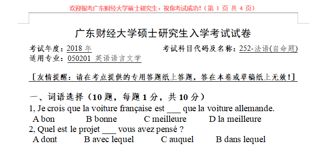 考研学习中,专业课占的分值较大。报考院校专业的考研专业课真题是专业课复习中必不可少的资料。聚创广东财经大学考研小编为大家整理了2018年广东财经大学252法语考研真题(完整版),并且可以提供广东财经大学考研专业课辅导,希望更多考生能够在专业课上赢得高分,升入理想的院校。