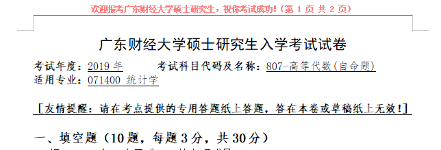 考研学习中,专业课占的分值较大。报考院校专业的考研专业课真题是专业课复习中必不可少的资料。聚创广东财经大学考研小编为大家整理了2019年广东财经大学807高等代数考研真题(完整版),并且可以提供广东财经大学考研专业课辅导,希望更多考生能够在专业课上赢得高分,升入理想的院校。
