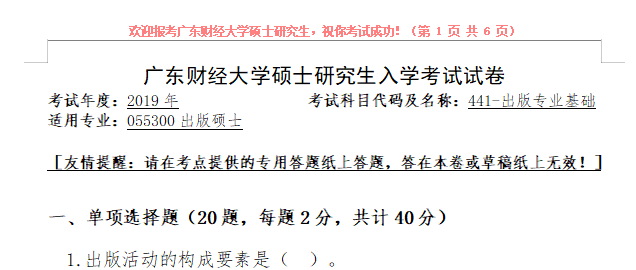 考研学习中,专业课占的分值较大。报考院校专业的考研专业课真题是专业课复习中必不可少的资料。聚创广东财经大学考研小编为大家整理了2019年广东财经大学441出版专业基础考研真题(完整版),并且可以提供广东财经大学考研专业课辅导,希望更多考生能够在专业课上赢得高分,升入理想的院校。