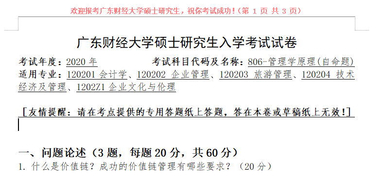 考研学习中,专业课占的分值较大。报考院校专业的考研专业课真题是专业课复习中必不可少的资料。聚创广东财经大学考研小编为大家整理了2020年广东财经大学806管理学原理考研真题(完整版),并且可以提供广东财经大学考研专业课辅导,希望更多考生能够在专业课上赢得高分,升入理想的院校。