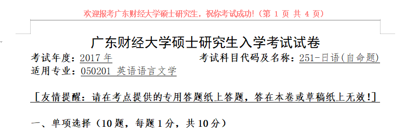 考研学习中,专业课占的分值较大。报考院校专业的考研专业课真题是专业课复习中必不可少的资料。聚创广东财经大学考研小编为大家整理了2017年广东财经大学251日语考研真题(完整版),并且可以提供广东财经大学考研专业课辅导,希望更多考生能够在专业课上赢得高分,升入理想的院校。