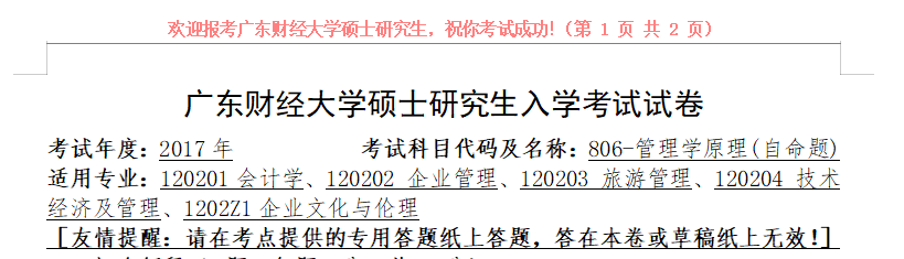 考研学习中,专业课占的分值较大。报考院校专业的考研专业课真题是专业课复习中必不可少的资料。聚创广东财经大学考研小编为大家整理了2017年广东财经大学806管理学原理考研真题(完整版),并且可以提供广东财经大学考研专业课辅导,希望更多考生能够在专业课上赢得高分,升入理想的院校。