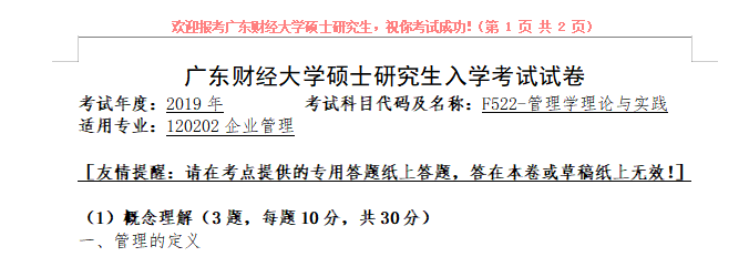 考研学习中,专业课占的分值较大。报考院校专业的考研专业课真题是专业课复习中必不可少的资料。聚创广东财经大学考研小编为大家整理了2019年广东财经大学F522管理学理论与实践考研真题(复试),并且可以提供广东财经大学考研专业课辅导,希望更多考生能够在专业课上赢得高分,升入理想的院校。