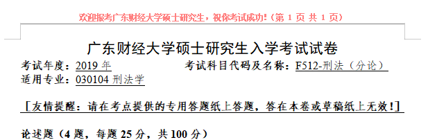 考研学习中,专业课占的分值较大。报考院校专业的考研专业课真题是专业课复习中必不可少的资料。聚创广东财经大学考研小编为大家整理了2019年广东财经大学F512刑法(分论)考研真题(复试),并且可以提供广东财经大学考研专业课辅导,希望更多考生能够在专业课上赢得高分,升入理想的院校。