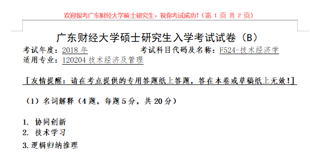完整版请下载附件:2018年广东财经大学F523技术经济学考研真题(复试)