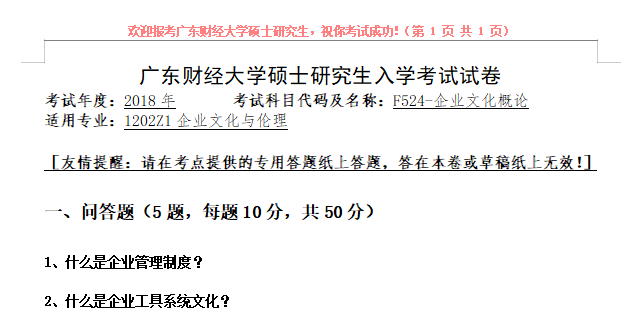 考研学习中,专业课占的分值较大。报考院校专业的考研专业课真题是专业课复习中必不可少的资料。聚创广东财经大学考研赖老师为大家整理了2018年广东财经大学F524企业文化概论考研真题(复试),并且可以提供广东财经大学考研专业课辅导,希望更多考生能够在专业课上赢得高分,升入理想的院校。