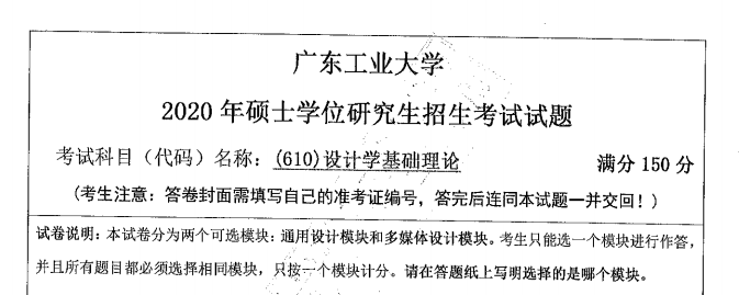 考研学习中,专业课占的分值较大。报考院校专业的考研专业课真题是专业课复习中必不可少的资料。聚创广东工业大学考研小编为大家整理了2020年广东工业大学610设计学基础理论考研真题(完整版),并且可以提供广东工业大学考研专业课辅导,希望更多考生能够在专业课上赢得高分,升入理想的院校。