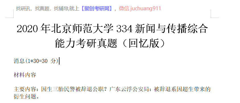 以上是聚创考研网为考生整理的"2020年北京师范大学334新闻与传播综合能力考研真题(回忆版)"的相关考研信息,希望对大家考研备考有所帮助! 备考过程中如有疑问,也可以添加老师微信juchuang911进行咨询。
