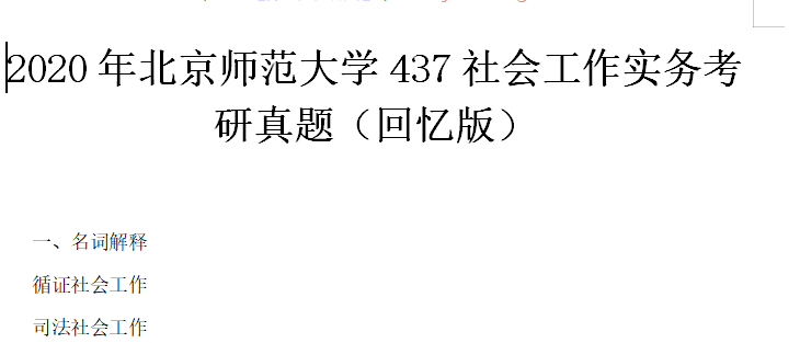 考研学习中,专业课占的分值较大。报考院校专业的考研专业课真题是专业课复习中必不可少的资料。聚创北京师范大学考研网老师为大家整理了2020年北京师范大学437社会工作实务考研真题(回忆版),并且可以提供北京师范大学考研专业课辅导,希望更多考生能够在专业课上赢得高分,升入理想的院校。