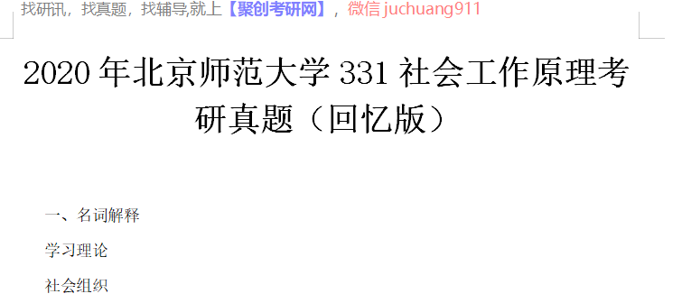 以上是聚创考研网为考生整理的"2020年北京师范大学331社会工作原理考研真题(回忆版)"的相关考研信息,希望对大家考研备考有所帮助! 备考过程中如有疑问,也可以添加老师微信juchuang911进行咨询。