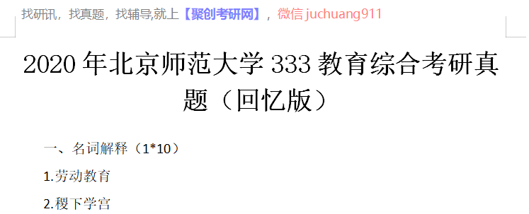 以上是聚创考研网为考生整理的"2020年北京师范大学333教育综合考研真题(回忆版)"的相关考研信息,希望对大家考研备考有所帮助! 备考过程中如有疑问,也可以添加老师微信juchuang911进行咨询。