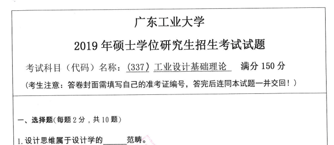 考研学习中,专业课占的分值较大。报考院校专业的考研专业课真题是专业课复习中必不可少的资料。聚创广东工业大学考研赖老师为大家整理了2019年广东工业大学337工业设计基础理论考研真题(完整版),并且可以提供广东工业大学考研专业课辅导,希望更多考生能够在专业课上赢得高分,升入理想的院校。