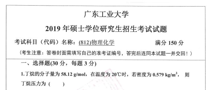 考研学习中,专业课占的分值较大。报考院校专业的考研专业课真题是专业课复习中必不可少的资料。聚创广东工业大学考研赖老师为大家整理了2019年广东工业大学812物理化学考研真题(完整版),并且可以提供广东工业大学考研专业课辅导,希望更多考生能够在专业课上赢得高分,升入理想的院校。