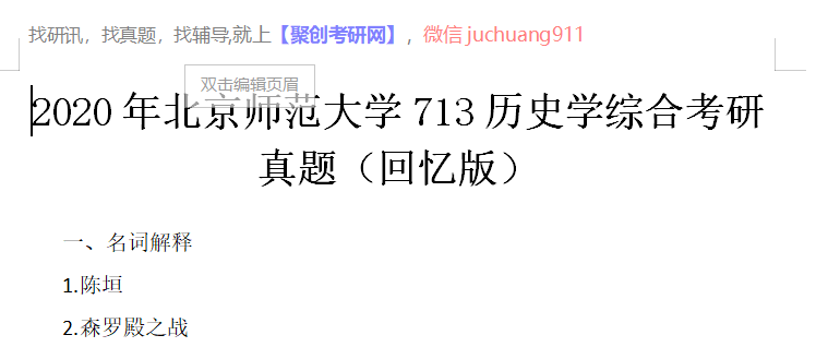 以上是聚创考研网为考生整理的"2020年北京师范大学713历史学综合考研真题(回忆版)"的相关考研信息,希望对大家考研备考有所帮助! 备考过程中如有疑问,也可以添加老师微信juchuang911进行咨询。
