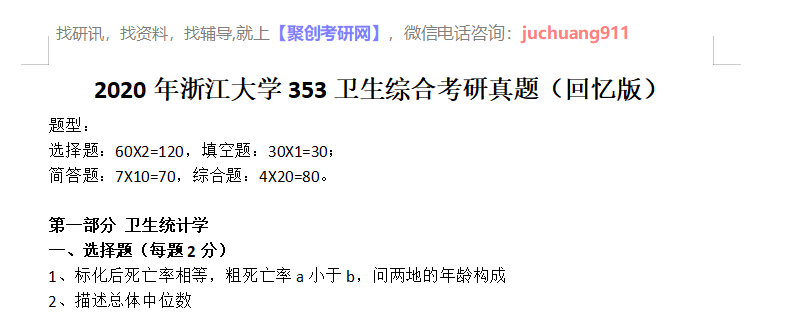 以上是聚创考研网为考生整理的"2020年浙江大学353卫生综合考研真题(回忆版)"的相关考研信息,希望对大家考研备考有所帮助! 备考过程中如有疑问,也可以添加老师微信juchuang911进行咨询。