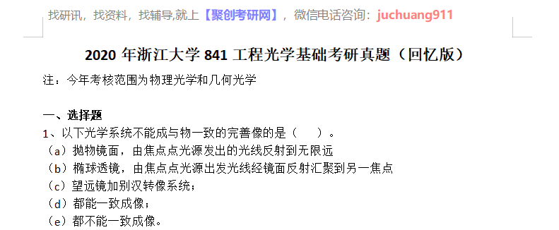 以上是聚创考研网为考生整理的"2020年浙江大学841工程光学基础考研真题(回忆版)"的相关考研信息,希望对大家考研备考有所帮助! 备考过程中如有疑问,也可以添加老师微信juchuang911进行咨询。
