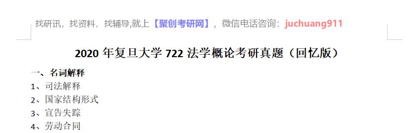以上是聚创考研网为考生整理的"2020年复旦大学722法学概论考研真题(回忆版)"的相关考研信息,希望对大家考研备考有所帮助! 备考过程中如有疑问,也可以添加老师微信juchuang911进行咨询。