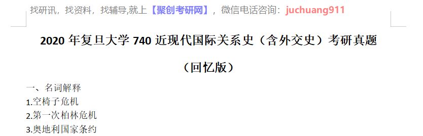 以上是聚创考研网为考生整理的"2020年复旦大学740近现代国际关系史(含外交史)考研真题(回忆版)"的相关考研信息,希望对大家考研备考有所帮助! 备考过程中如有疑问,也可以添加老师微信juchuang911进行咨询。