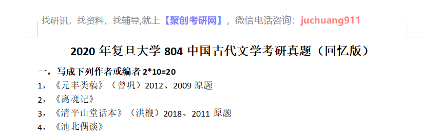 以上是聚创考研网为考生整理的"2020年复旦大学804中国古代文学考研真题(回忆版)"的相关考研信息,希望对大家考研备考有所帮助! 备考过程中如有疑问,也可以添加老师微信juchuang911进行咨询。