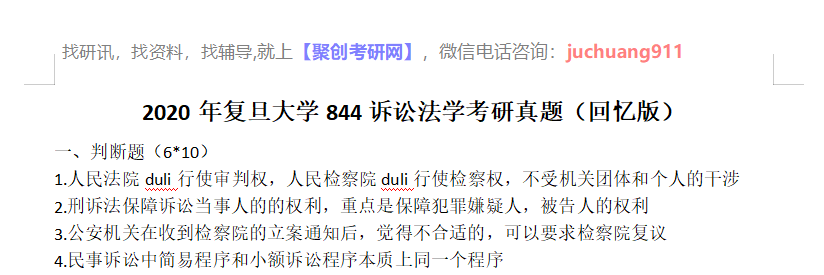 以上是聚创考研网为考生整理的"2020年复旦大学844诉讼法学考研真题(回忆版)"的相关考研信息,希望对大家考研备考有所帮助! 备考过程中如有疑问,也可以添加老师微信juchuang911进行咨询。
