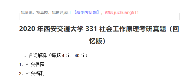 以上是聚创考研网为考生整理的"2020年西安交通大学331社会工作原理考研真题(回忆版)"的相关考研信息,希望对大家考研备考有所帮助! 备考过程中如有疑问,也可以添加老师微信juchuang911进行咨询。