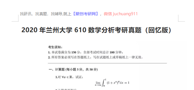 以上是聚创考研网为考生整理的"2020年兰州大学610数学分析考研真题(回忆版)"的相关考研信息,希望对大家考研备考有所帮助! 备考过程中如有疑问,也可以添加老师微信juchuang911进行咨询。