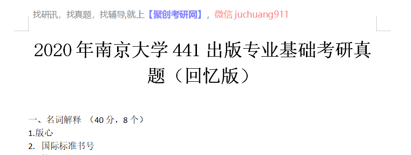 以上是聚创考研网为考生整理的"2020年南京大学441出版专业基础考研真题(回忆版)"的相关考研信息,希望对大家考研备考有所帮助! 备考过程中如有疑问,也可以添加老师微信juchuang911进行咨询。